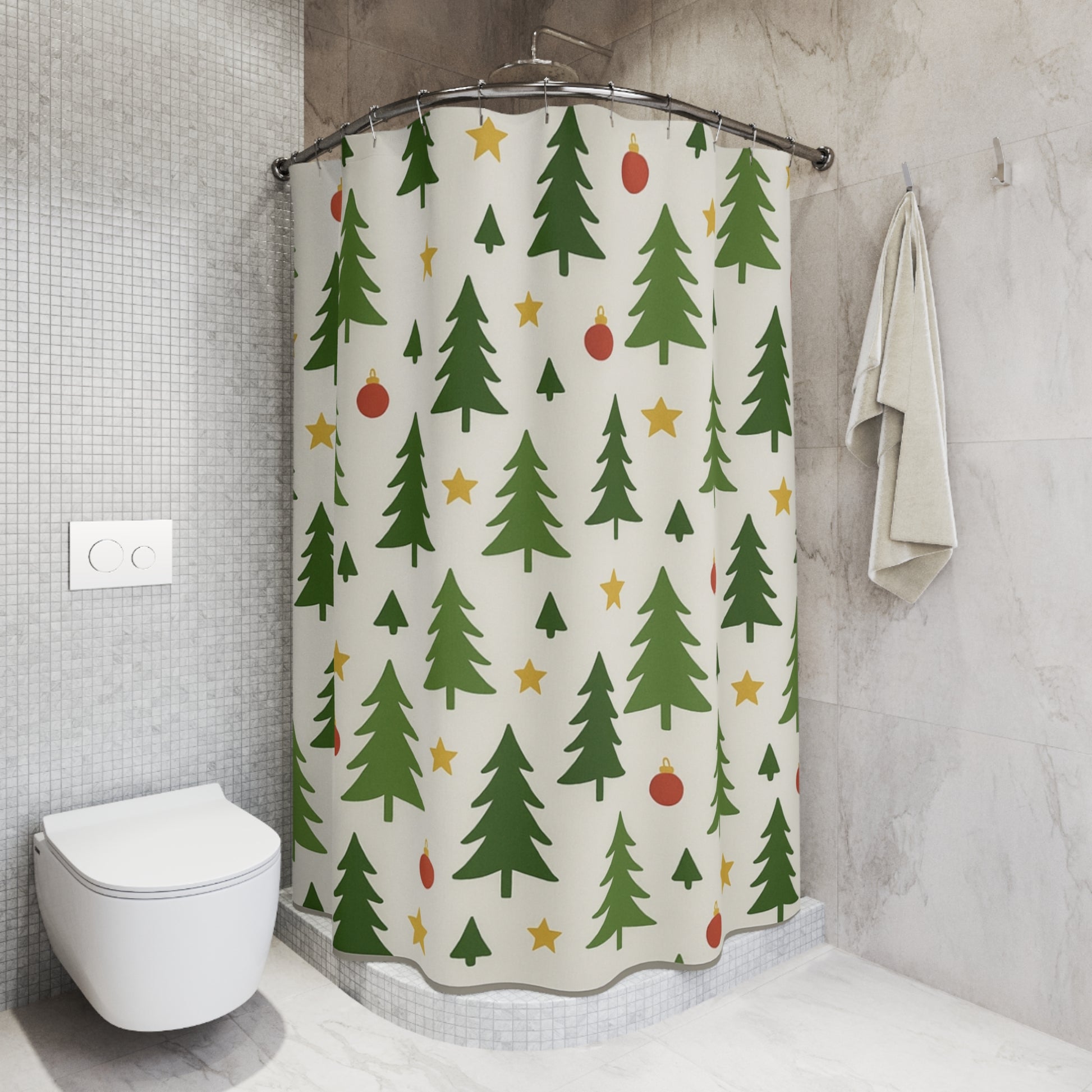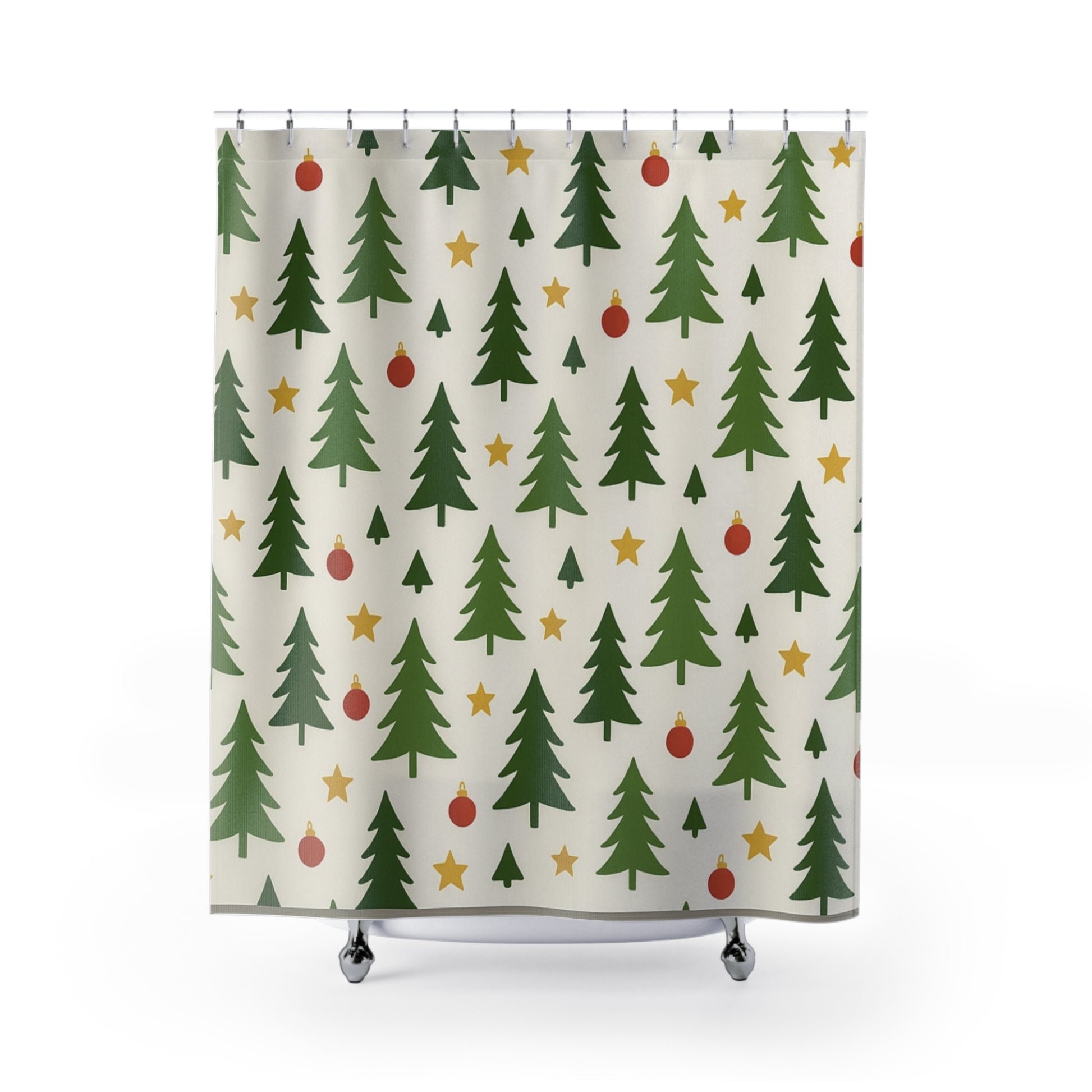 Bring a quiet, cozy holiday spirit into your bathroom with this tree-pattern shower curtain. Soft green fir silhouettes, warm golden stars, and simple red baubles float across a creamy background, creating a calm, nostalgic feel — like a slow morning wrapped in familiar festivities. The lightweight polyester drapes easily and moves with the steam of a hot shower, adding a gentle seasonal touch without shouting for attention. Hang it on a curved rod to let the print breathe, and let small moments — a steaming cup, a soft towel, a quiet playlist — feel a little more like the holidays.