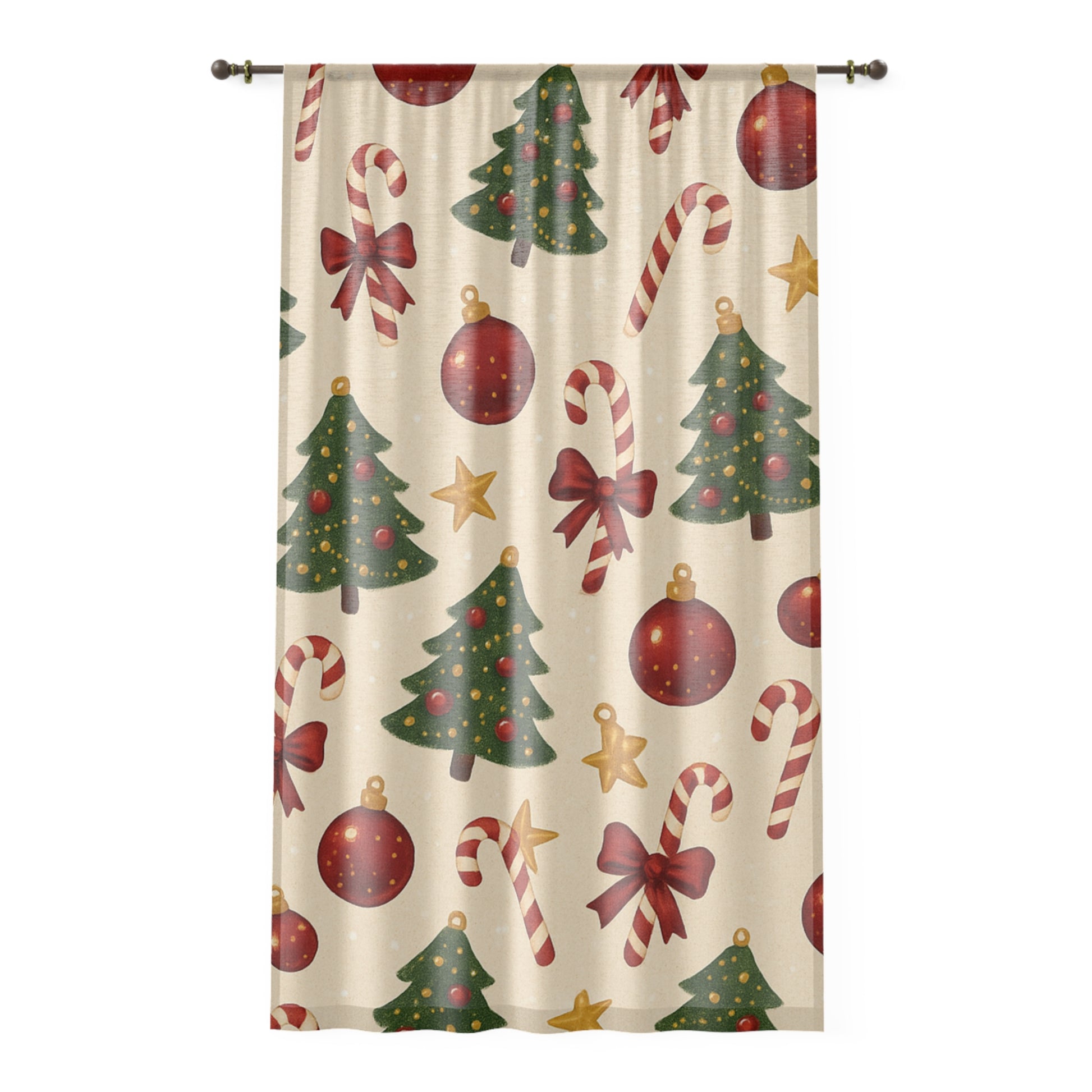Sheer Christmas Pattern Window Curtain — Festive Trees, Candy Canes & Ornaments